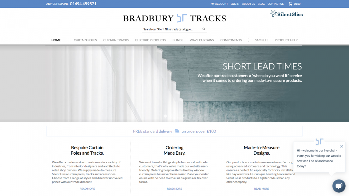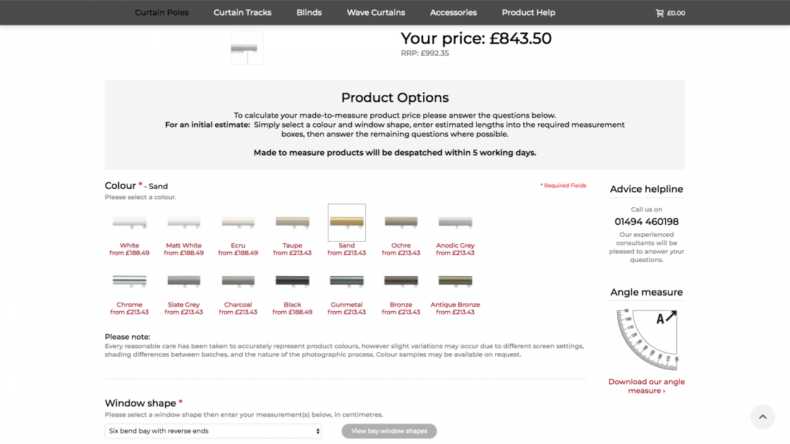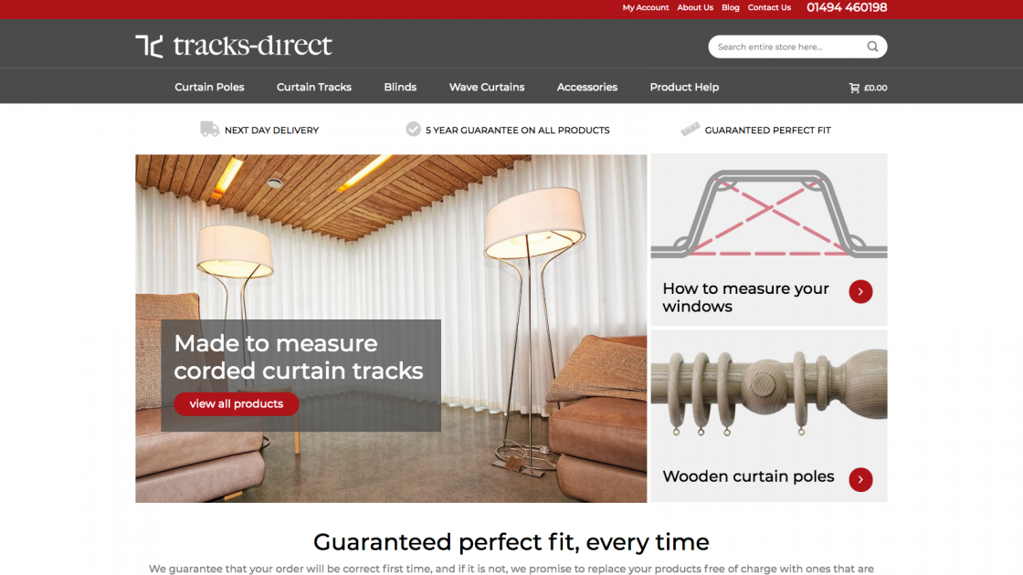 The Tracks-Direct e-commerce website allows customers to order curtain tracks and poles to the exact measurements of their bay windows. The site also includes blinds, curtains and accessories – as well as electric versions of their poles, tracks and blinds.